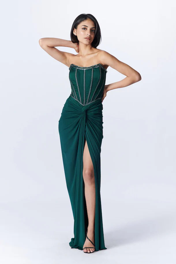 This corset gown with faux leather detailing represents a vision of modern bold dressing. The draped bottom with an added slit adds glamour to the look upgrading your fashion quotient