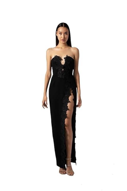 HARLIV Strapless Gown Wired Bodice Lined with Floral Lace Applique Black Dress for Women Modelling Red arpet Ready